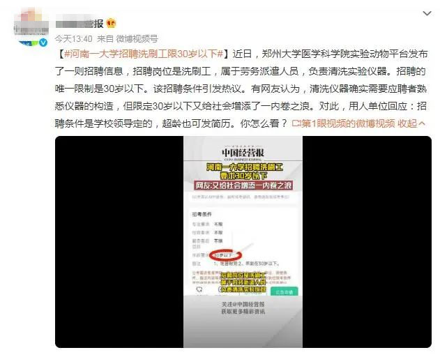 事情的起因是,鄭州大學(xué)醫(yī)學(xué)科學(xué)院實驗動物平臺發(fā)布了一則招聘信息,招聘崗位是洗刷工,屬于勞務(wù)派遣人員,負(fù)責(zé)清洗實驗儀器。招聘的限制是30歲以下。消息一出,引發(fā)網(wǎng)友熱議。